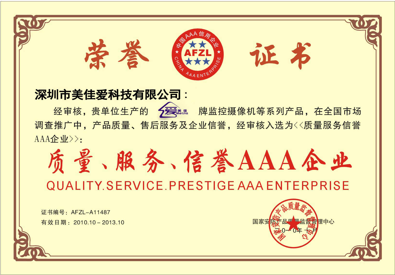 質(zhì)量、服務(wù)、信譽(yù)AAA企業(yè)證書副本